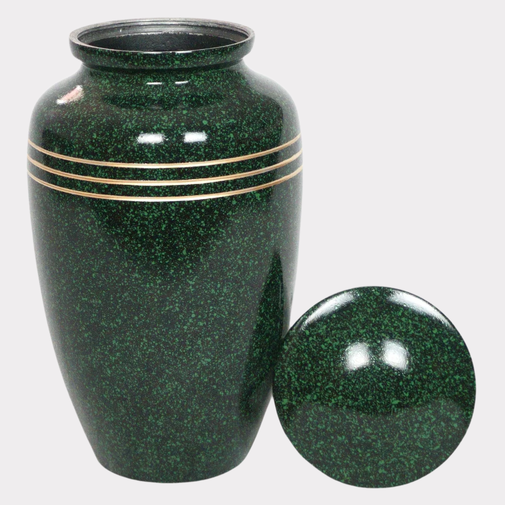 Remember your loved one with the Emerald Galaxy Cremation Urn, featuring a timeless dappled starry design and beautiful gold stripe accents. This elegant urn is a perfect tribute to their memory.
